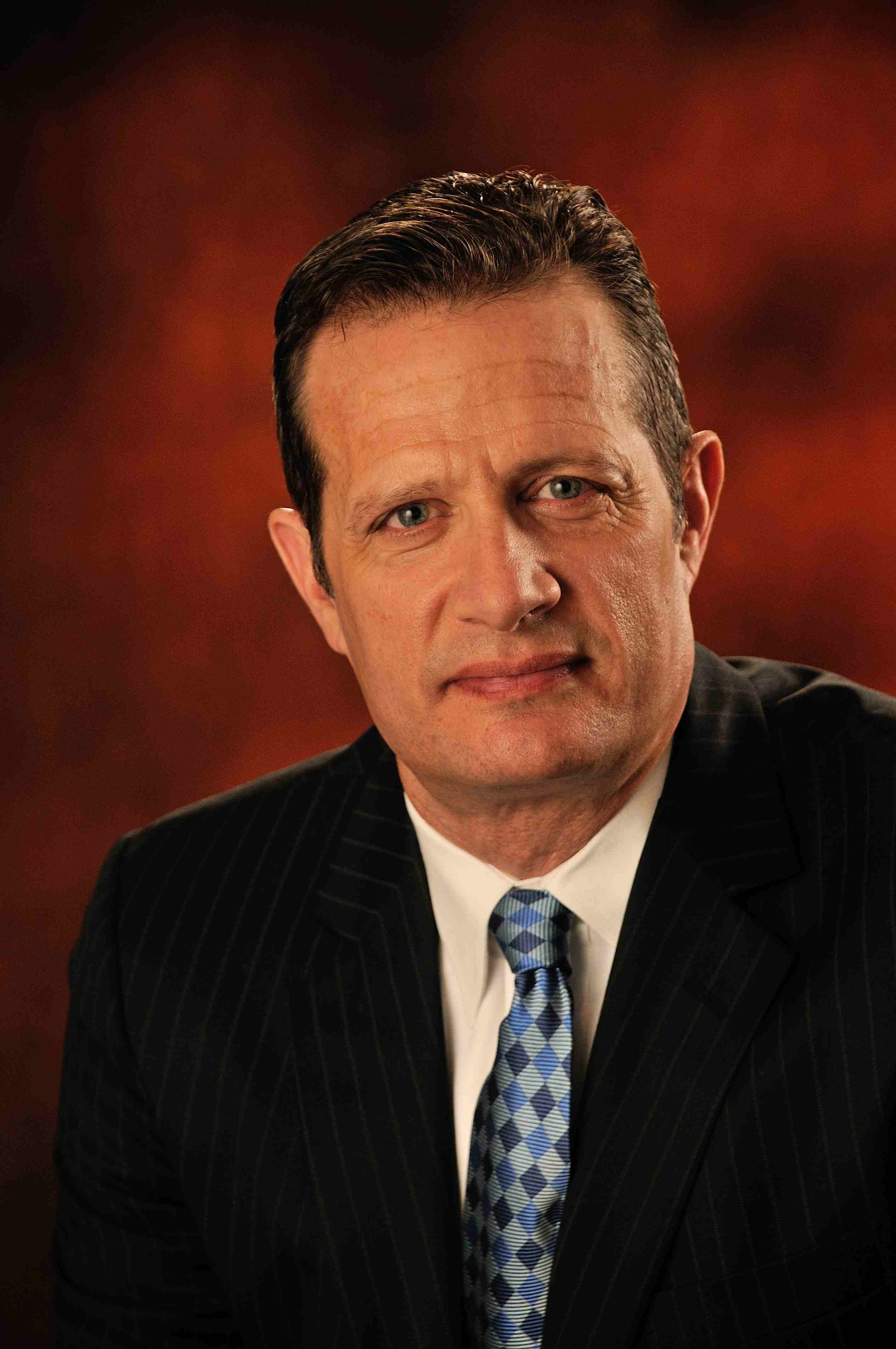 • A stern, overly dramatic headshot with heavy shadows and no smile